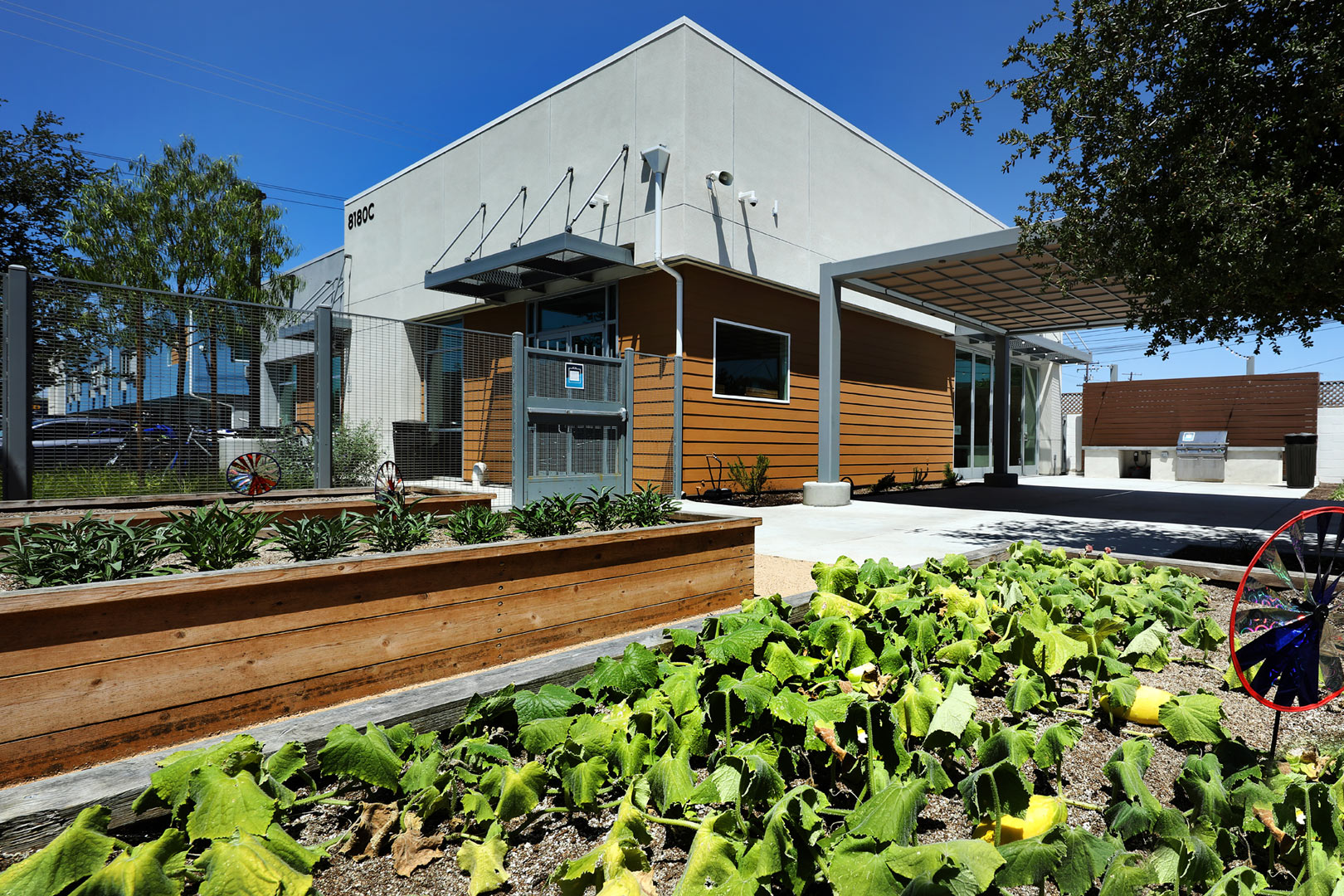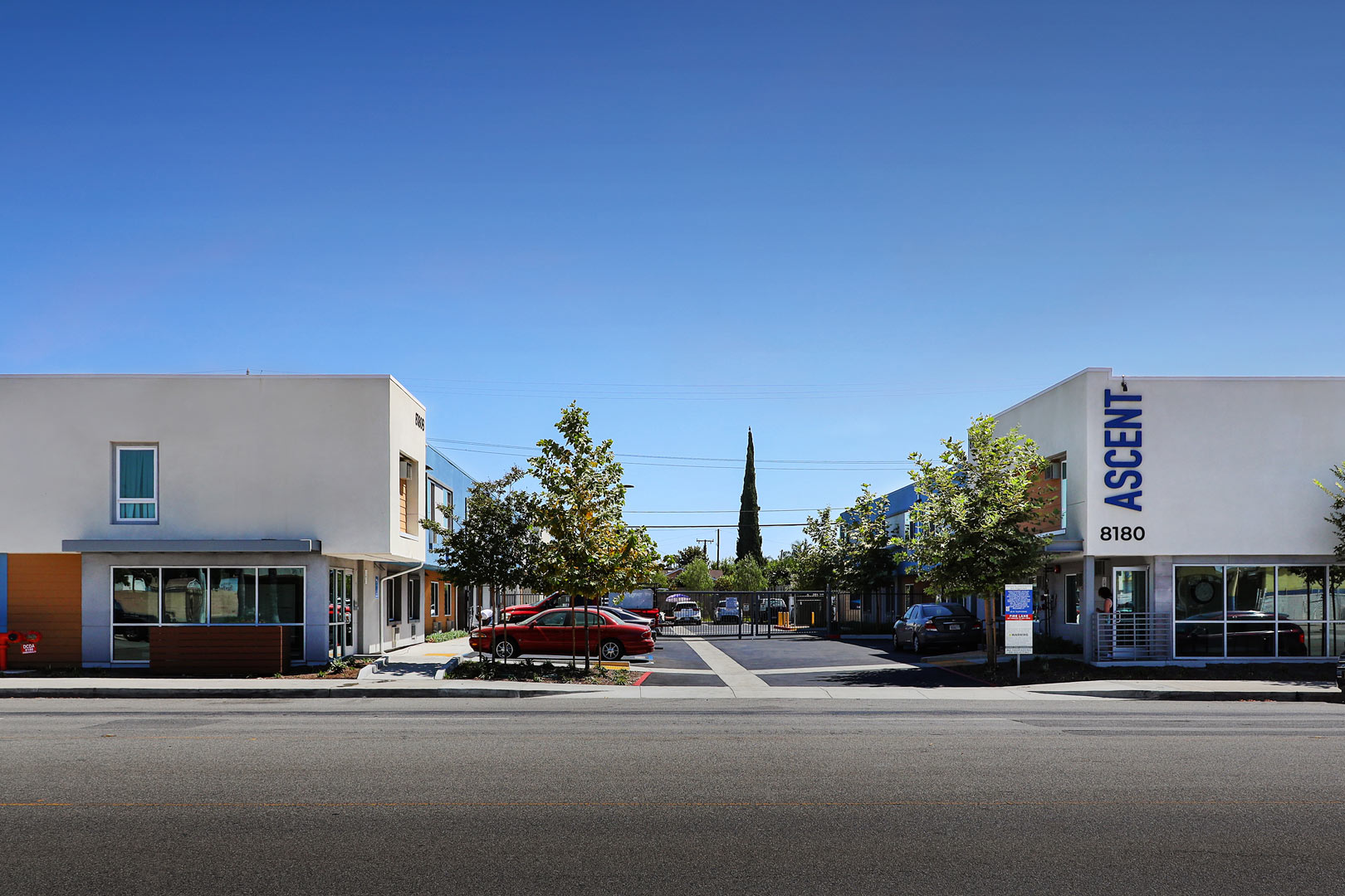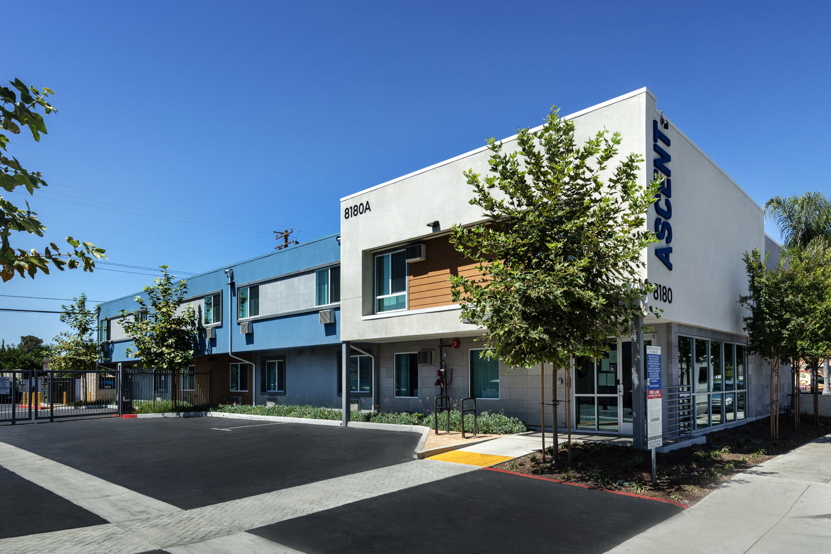Ascent is a permanent supportive housing project in Buena Park, CA. The project involves the renovation of two existing two-story buildings, and constructing a new one-story building for leasing and services. The project provides 57 studio units and one two-bedroom unit on a 0.8 acre site. Outdoor amenities include bike parking, an outdoor kitchen, a community garden, a dog run, a basketball hoop, and fitness equipment.