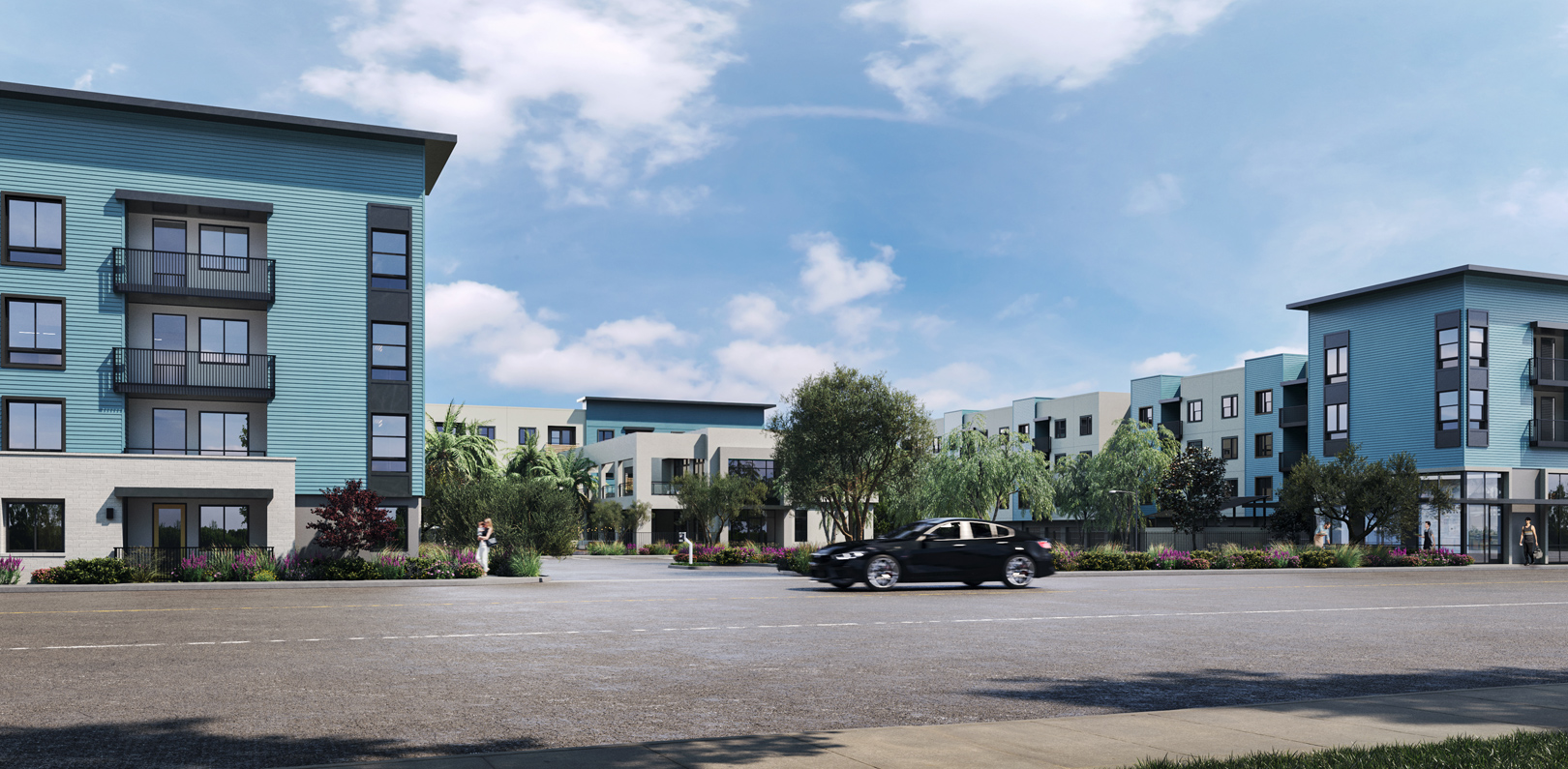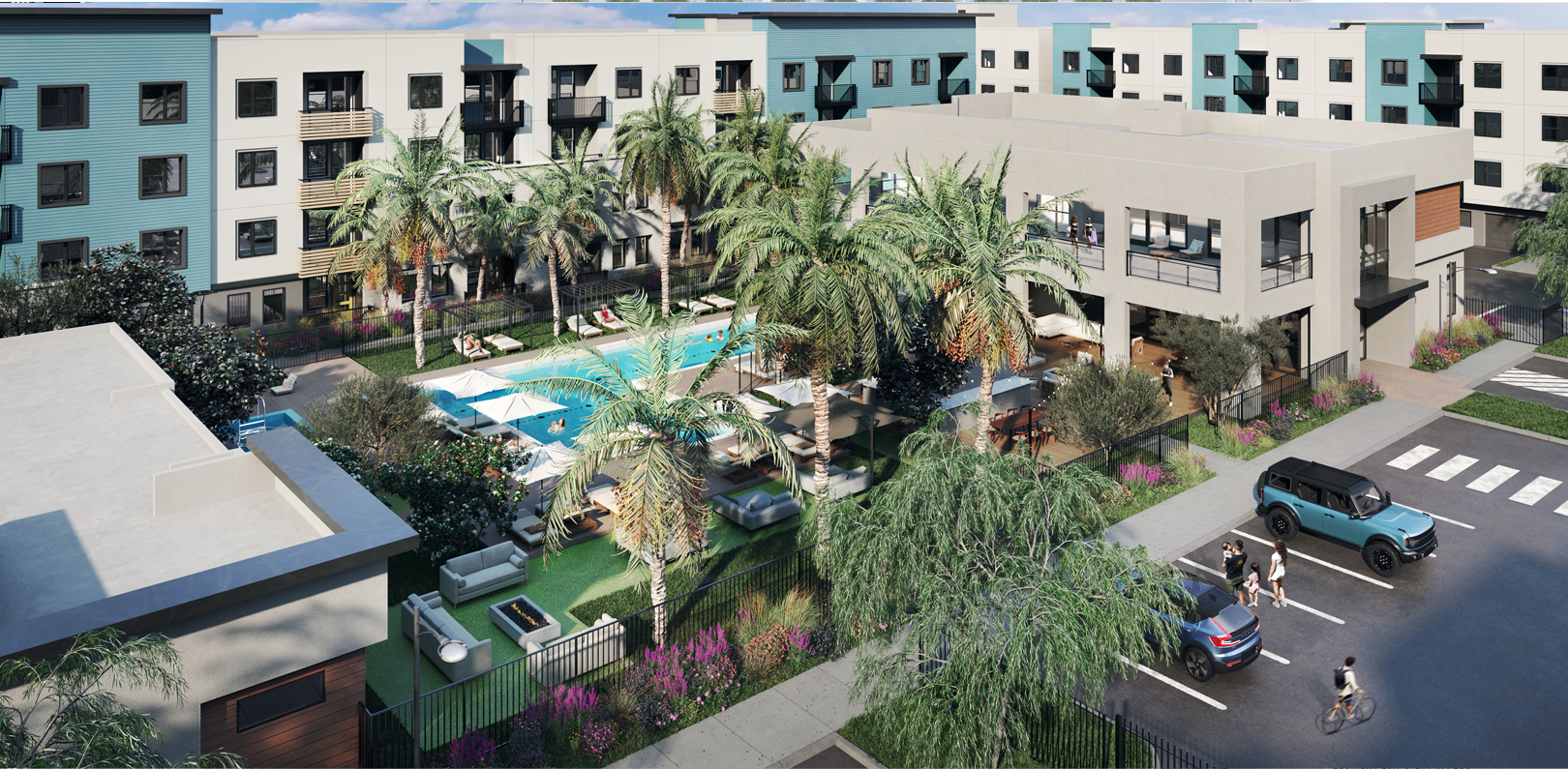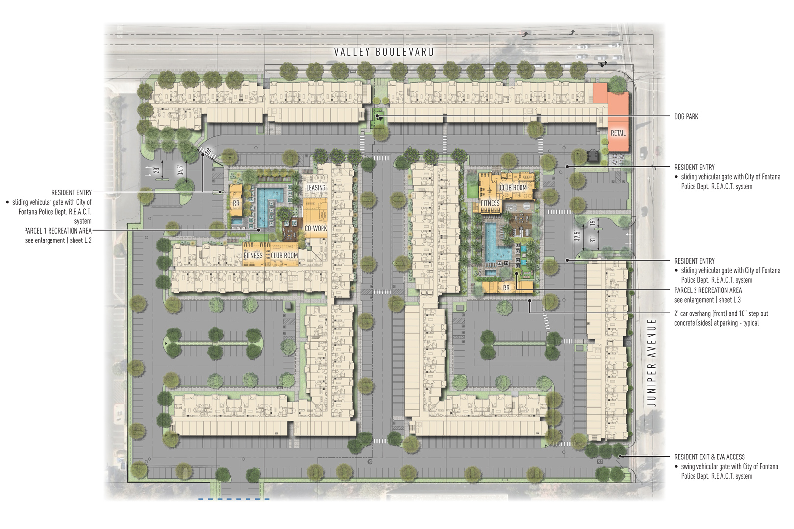 The proposed mixed-use project consists of 437 units, utilizing on-grade tuck-under garage buildings. A mix of units one, two, and three bedroom units are spread across five different four-story residential buildings. The project also proposes three different amenity buildings and totaling over 16,000 SF. Such amenities include multiple fitness centers, business centers, club rooms, a pet spa, and long-term bike storage. In addition, a 4,000 SF retail space sits on the corner of the site.