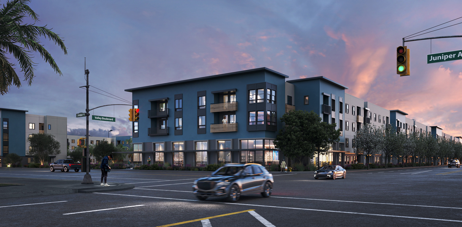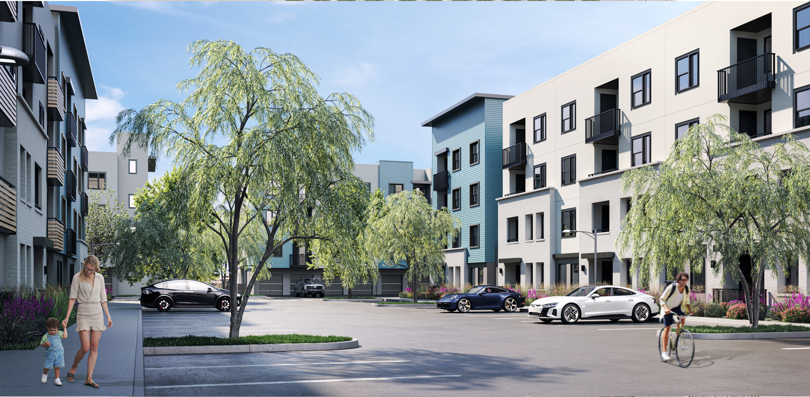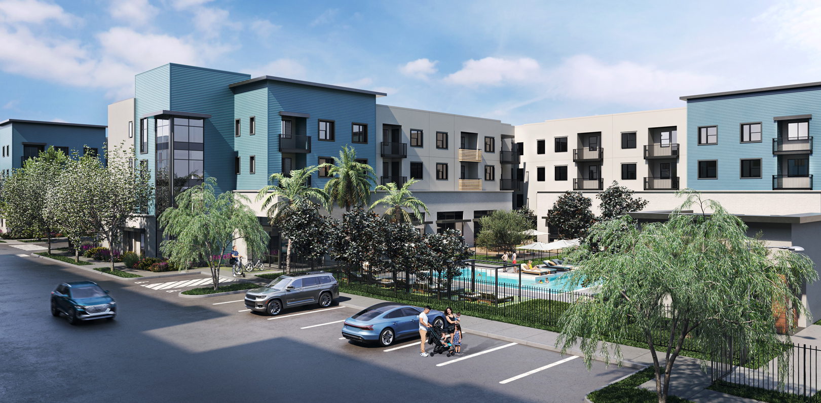 The proposed mixed-use project consists of 437 units, utilizing on-grade tuck-under garage buildings. A mix of units one, two, and three bedroom units are spread across five different four-story residential buildings. The project also proposes three different amenity buildings and totaling over 16,000 SF. Such amenities include multiple fitness centers, business centers, club rooms, a pet spa, and long-term bike storage. In addition, a 4,000 SF retail space sits on the corner of the site.