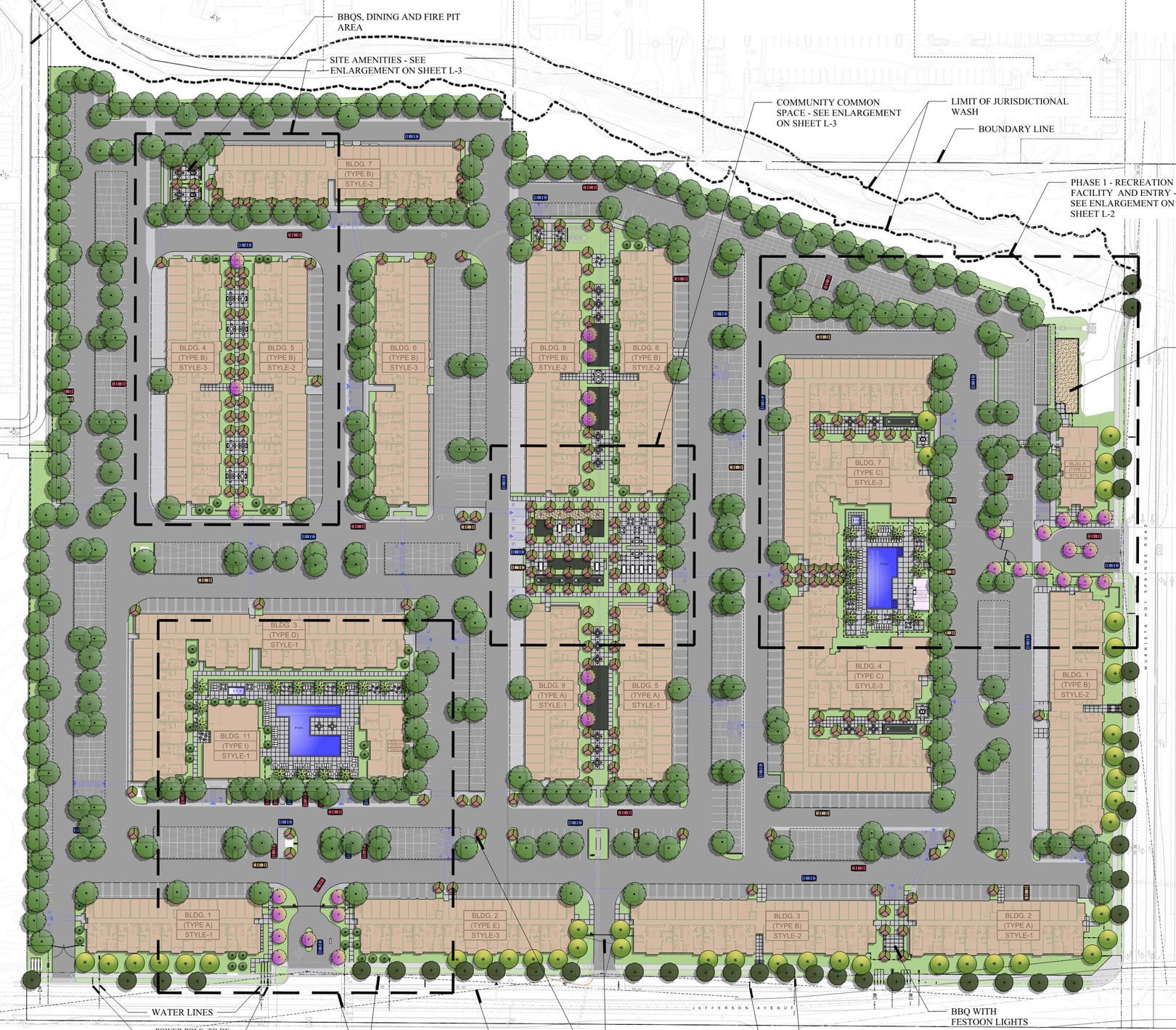 Jefferson Murrieta is an expansive multi-family development that consists of 852 units within 16 residential buildings, as well as four leasing/amenity buildings on a 31.69 acre site. The project contains one, two, and three-bedroom dwelling units between a combination of four-story on grade and tuck-under garage buildings. The site offers 74 different amenities across 18,000 SF of indoor leasing/amenity space and over 117,500 SF of outdoor common open space. Indoor amenities include multiple fitness centers, buisiness centers, pet spas, and club rooms. Outdoor amenities spaces include several pool and spa areas, many fire pit, barbeque, and lounging areas, and a dog park. This project features three different architectural styles across the site, with buildings designed in either Irving Gil, Modern Agrarian, or Contemporary styles.